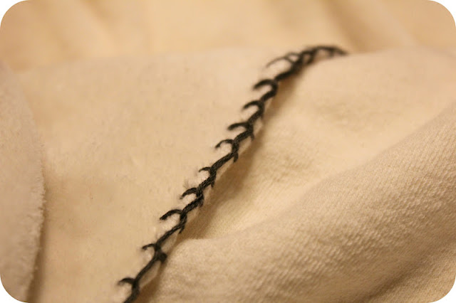 The plan was to sew a blanket stitch around the edge (this is the part that takes the longest and I like the least). In order to do it evenly I use a sheet of paper taken from a sprial bound notebook and using the holes along the edge of the paper I line it up against the edge of the fabric and with a fabric pen, I draw a dot in each hole as I go along, all the way around. Hope that made sense.