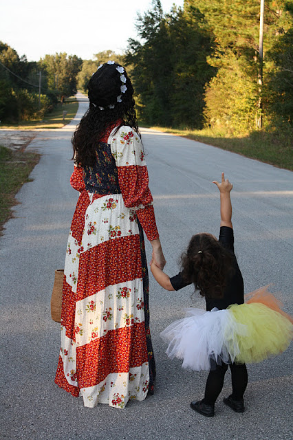Happy Hallows Eve everyone! Just a few pictures…We are back from trick or treating and all very exhausted. The kids did not want to wear the costumes I made them for All Saints Day for Halloween night too, so I told them if they could make up a costume on their own, they could definitely wear it tonight. They all came up with some pretty funny costumes and had a blast walking all night and collecting candy. Unfortunately our camera died after just a few pictures so I only have pictures of Livie and I and one picture of us walking down our street before heading out to our friends nieghborhood.