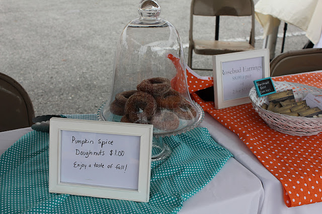 We made many batches of cookies, white chocolate almond, chocolate chip and raisin oatmeal. I made a huge batch of pumkin spice douhgnuts and vanilla ice cream as well as devils food snickers push pop cupcakes. We got everything packed up and headed out at 8:30 AM to set up at 9.