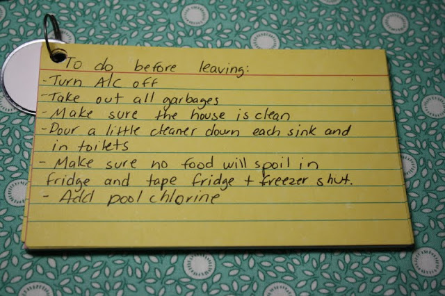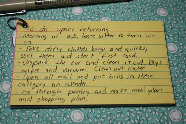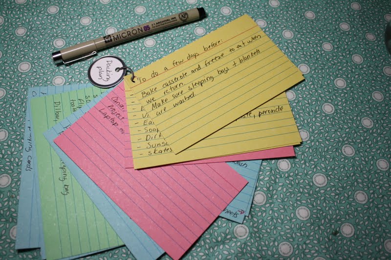 One index card for each person going on the trip, write everything they will need to take on the trip. I include reminders such as my glasses, sketch pad and beeswax crayons and color pencils.