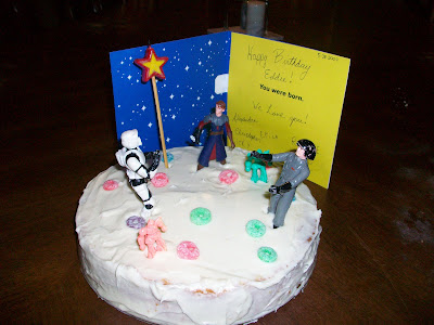 Lately, whenever one of our household’s members needs a cake, Nicholas has been stepping in to make it. When you live with a cake designer, your children are apt to follow. This time he came up with a Star Wars theme since his brother loves Star Wars. Most of the cake is self-explanatory but the fruit loops may not be as much, they are the craters on the moon. Alex and Nick made a coconut flavored cake and a cream cheese frosting. It was quite yummy and absolutely no help from me was necessary. Happy Birthday Eddie and congrats to Alex and Nick on a yummy cake.