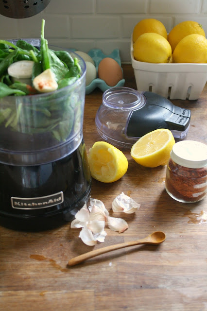 put the spinach, garlic, cayenne and lemon in the food processor and combine until roughly chopped but not too pureed