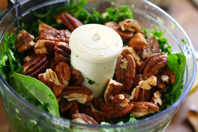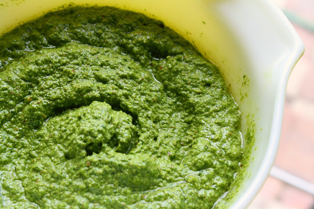 I love pesto, yes I do.  Basil almond pesto is my favorite but we don’t have enough basil during the winter months and so there are many other types that we like to make.