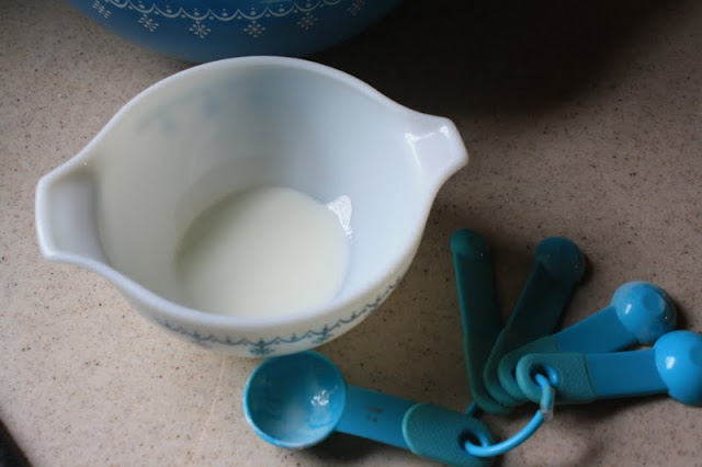 While you are doing this, measure out three tablespoons of your yogurt starter. Put the starter in a bowl so that it gets to room temperature.