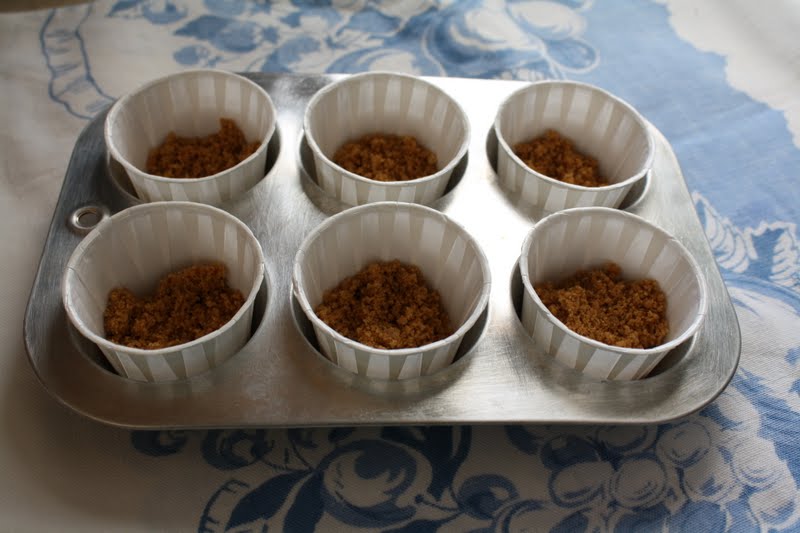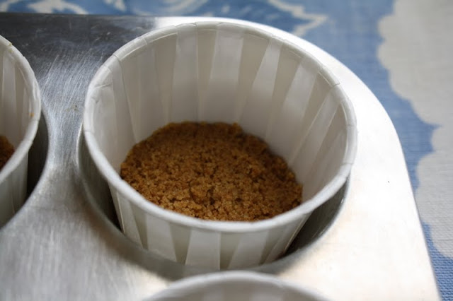 Preheat the oven to 350 degrees. Crush enough graham crackers in your food processor or blender to make a cup and a half. In most boxes of crackers the cookies are divided into packs, I used one whole pack which I think is about 1/4 of the box. Mix in the butter and sugar and add a heaping tablespoon to each cupcake liner.