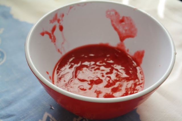 To make the raspberry puree, put the berries and sugar in the blender and blend until smooth. Put through a sieve to strain out the seeds and set aside. This puree in itself would be enough dessert for me but I was making this for Poppa and you didn’t read this far just to eat raspberries so lets keep going.