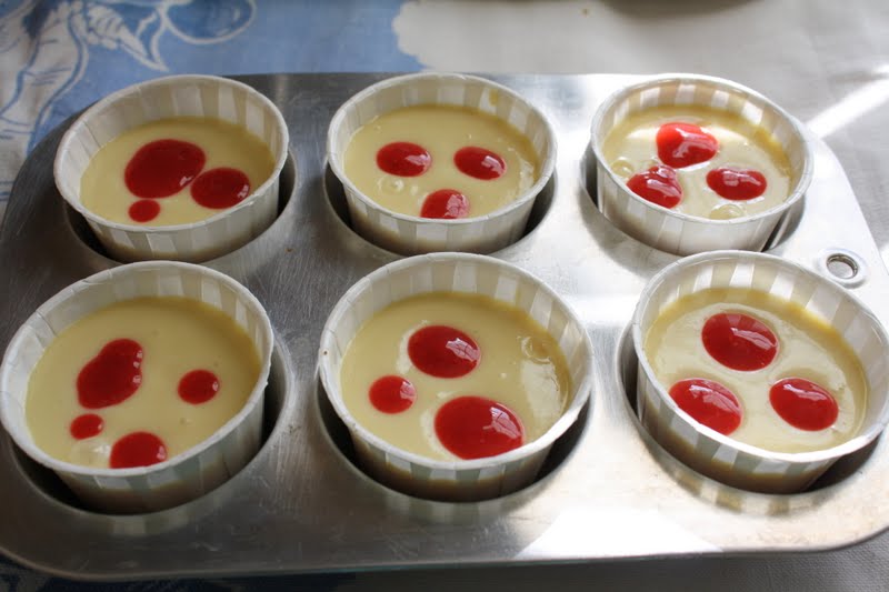 Into your mixer add the cream cheese, mix until smooth. Slowly add the sugar and then the eggs one at a time. Add the vanilla and the melted chocolate. Beat until no lumps are seen. Ladle the cream cheese mixture into the cups. Drop a few dots of raspberry puree on the tops of the cheesecakes.