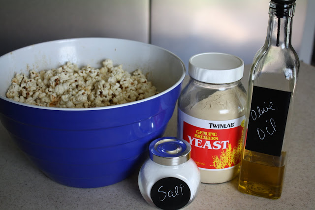 Lets start with what nutritional yeast is.  It is not the yeast that is used to make bread. It is a nutritional powerhouse and one of the few non-animal sources of B-12, is rich in folic acid and many other nutrients and amino acids. The great part is that is has a cheesy, nutty flavor which goes so great on lots of foods but to me most importantly popcorn