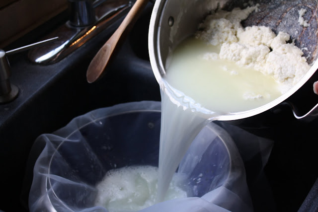 Cheesecloth (I use some sheer curtain fabric because I hate to throw away and continue buying cheese cloth plus the weave is much smaller and the cheese looks nicer to me. Shhhhh, thats my little secret that I share with you. Go get one of those old curtains out of your linen closet and give it a new home. The liquid goes right through but the solid stays perfectly, much better than cheese cloth.