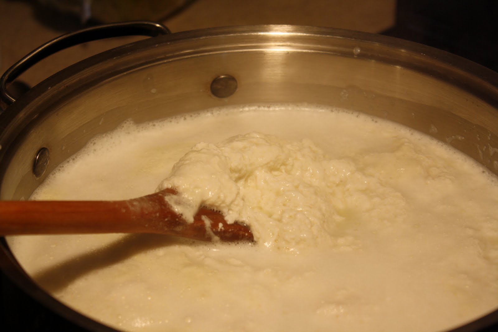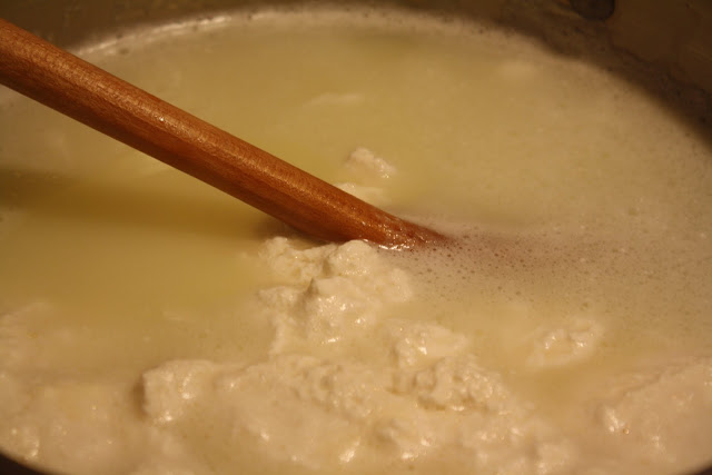 You will start to notice the solids separating from the liquid. This is the curd and they whey (just like in Little Miss Muffet).