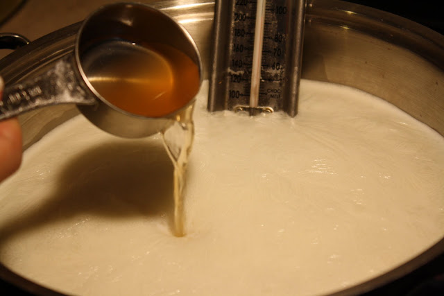 heat your milk to between 180 to 185 F. If you do not have a thermometer, just watch it to the moment right before the milk boils. Add 1/4 cup of vinegar to your pot