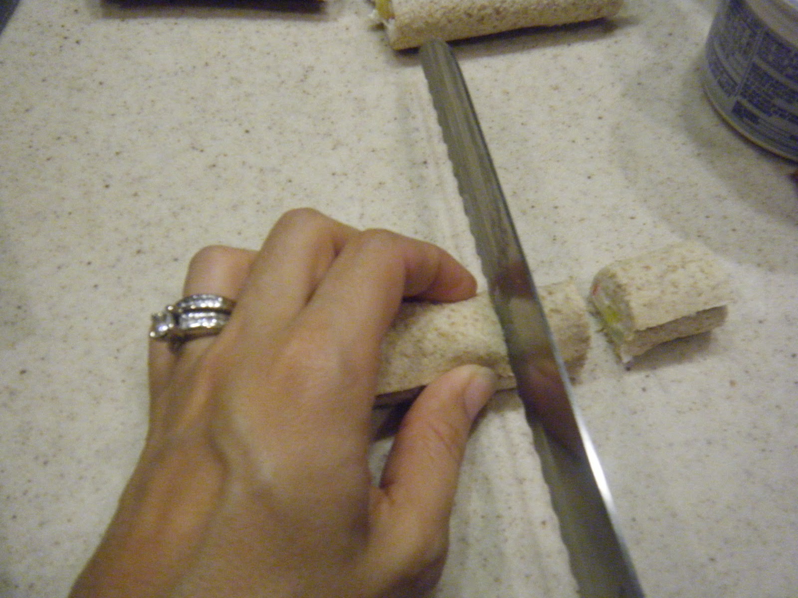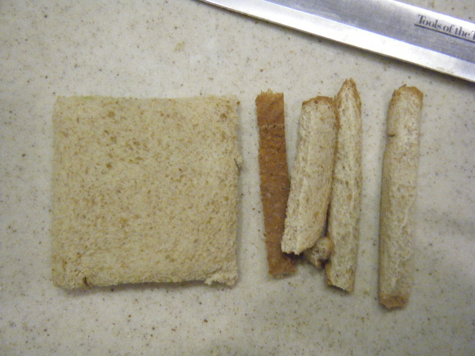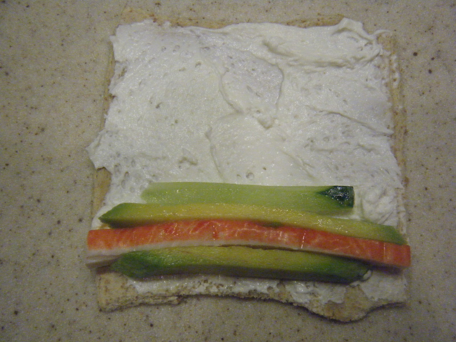Take the cream cheese (if you make kefir spread it works good too) and spread it on the bread, not too little but not too thick. Slice avocado, cucumber and surimi into long strips. Lay them on one side of the bread.
