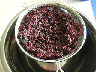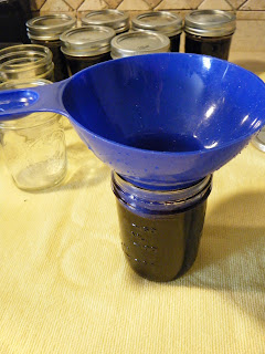 Pour through a metal sieve (do not throw away mashed pulp) pour the syrup into your hot sterilized jars, put your lids and bands on tight and put back into the pot of boiling water for 10 minutes. Make sure the jars are covered by at least 1-2 inches of water. I have a tool which pulls the jars in and out of the water and another which is a wand with a magnetic end to get the lids out of the pot without burning yourself. I bought them from Ball and if you want to do any amount of canning at least treat yourself to these 2 items.