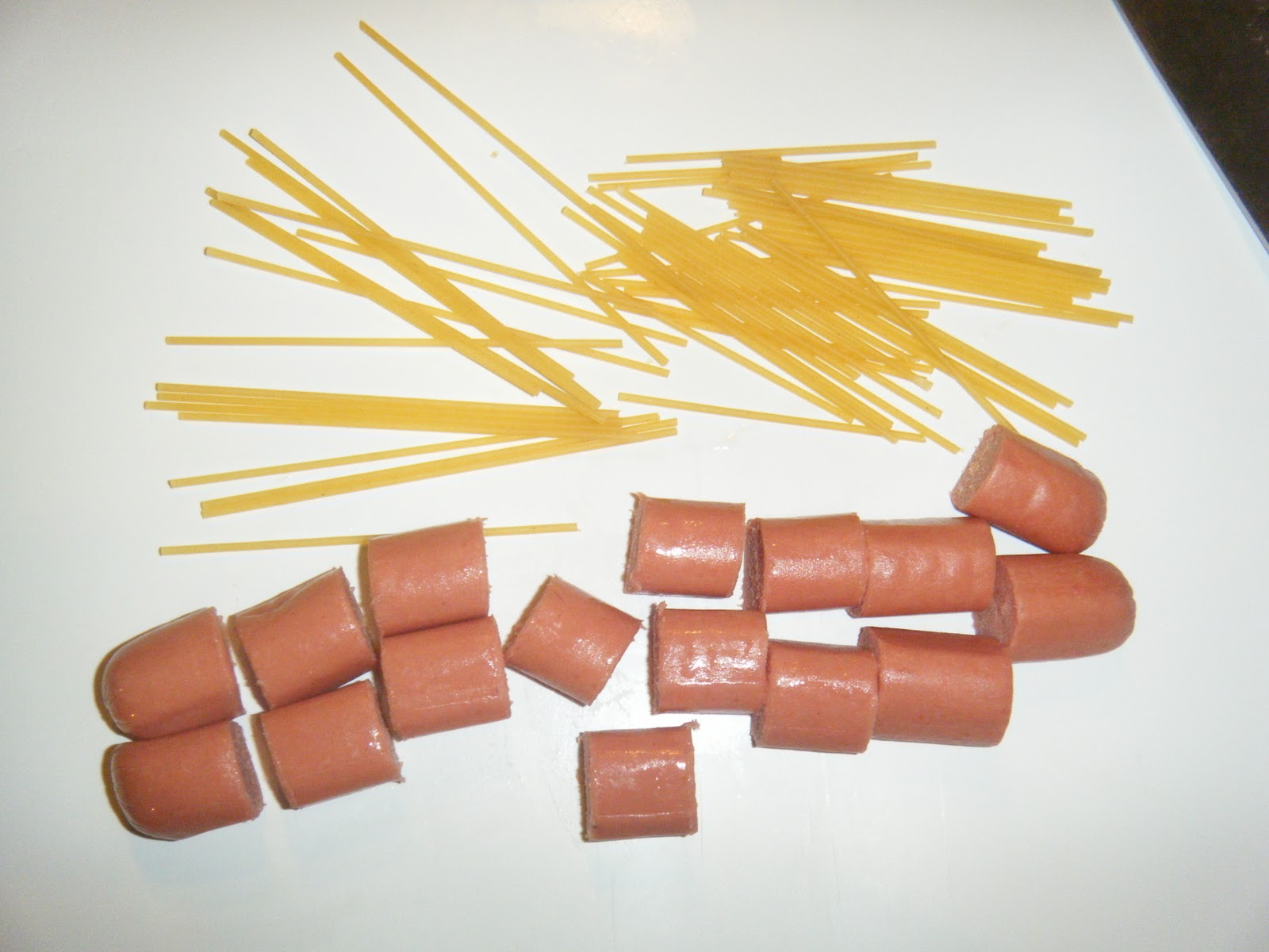 If you can, buy nitrite free hotdogs at your healthy store.  Whole foods has a few options.  First, get a pot of water on the stove to boil. Slice your hotdogs and then take your thick sphaghetti and while holding the bunch in your hand just snap it in half.
