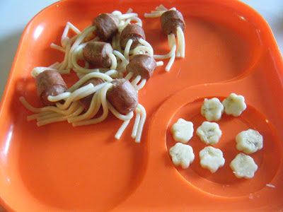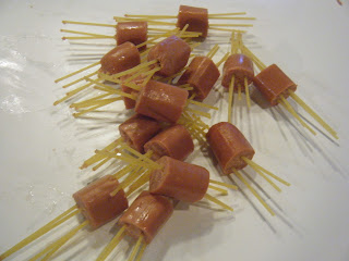 Push a few strands of pasta into each hotdog piece (I did four per each piece).