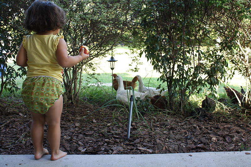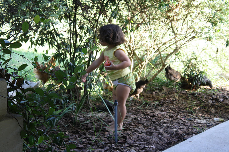 Olivia (in her natural playing state of dirtyness) was enjoying her apple when she spotted Rooster and Hen (also known as Mr and Mrs Duck) getting in on the front porch action and had to go investigate pester the poor ducks and chickens. Those two really think they are chickens.