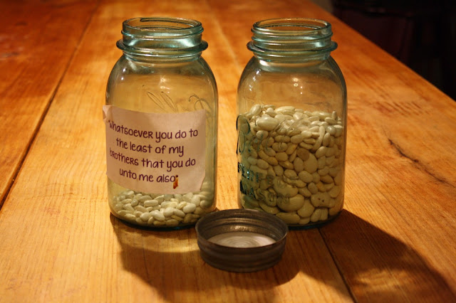 For everyone who emailed me about the soup we make on Holy Friday from our jar of Lenten beans, (explanation here) I am happy to report that the soup was plentiful and we were very grateful to have such full bellies. I was so proud of the kids. With their sacrifices and good deeds during all of lent, they almost completely emptied the jar of beans. We made a wonderful white bean and homegrown Tuscan kale soup. I love these visual reminders of charity for the kids.