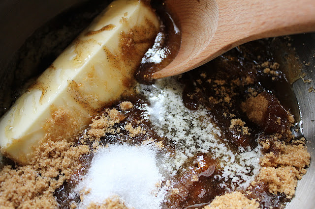 In the meanwhile, in a saucepan, bring to a simmer the sugar, honey, butter, salt and vanilla. This will be the glue in the recipe.