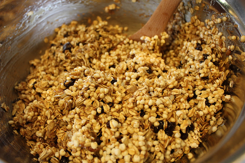 Grease a baking pan (or line the pan with parchment paper). I did not use the parchment paper but it does make it easier to pull out the granola from the pan. Press it all into the pan really firmly with the spoon then cover it with some wax paper and press down really hard all over.