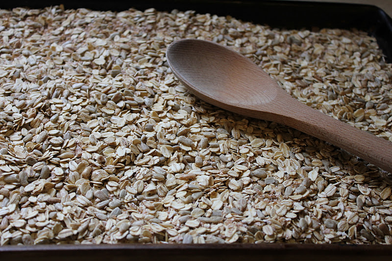 Preheat oven to 400 F. Toast the oats and sunflower seeds in the oven for 10 minutes.