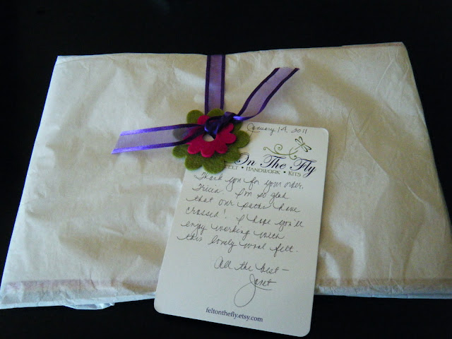 I ordered some wool felt from a new source last week, a wonderful store called Felt on the Fly. From the moment I asked a few questions to the shop owner and placed my order I received nothing but the best service and made a new friend. This girl is super cool and today when I got my package I was so impressed by the felt but the best part was the thought she put into packaging it and even included some wool felt swatches and a cute little ornament.