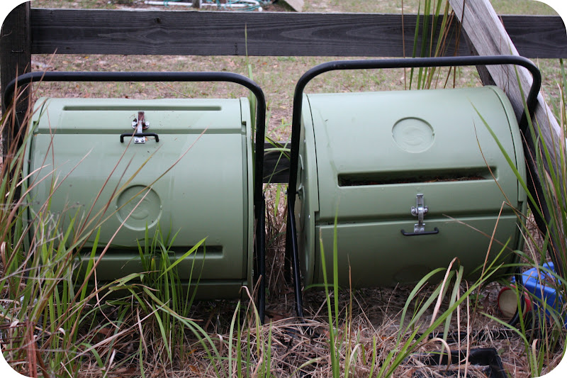 my trusty compost tumblers (mothers day gift 5 years ago) surrounded by more weeds that need to be pulled. We put any food compost in here and everything else in the big pile. Otherwise, we get too many critters looking for the buffet line.