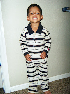 The first pajama set was very simple, for Christopher, I decided on a one piece because he is small enough to fit in through the neck hole so I can use the ready made collar and button holes in the front. I cut off enough on each side to make it the perfect width for his frame and then I cut off the sleeves and reattached them to the new smaller body. Lastly, I cut a slit up the bottom through both layers of the shirt to make legs, sewed it all up and voila. Refashioned pajamas for my little guy for free and the project took less than one hour.