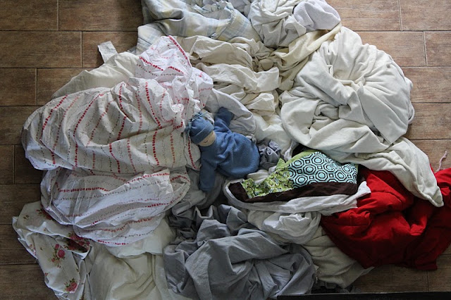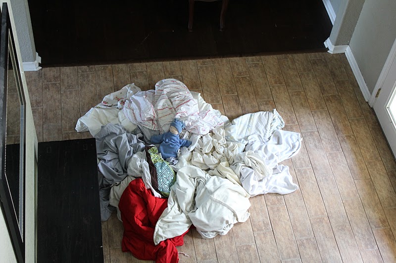 The kids strip all the beds and throw all the bedding over the banisters into a pile down in the foyer. Today, I was taking the picture and found a little dolly thought the pile looked comfy and was sweetly resting among the sheets and blankets.