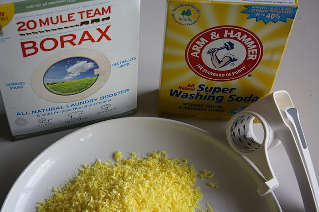 Grate up the bar of soap, I whirl it around quickly in my food processor to make the soap shreds into a powder then add the other ingredients and mix it all up good. Put it into your laundry container and use 1 tablespoon per load or 2 tablespoons for bigger loads.