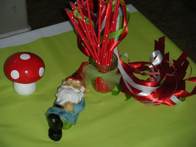 I spent weeks making ribbon wands and tiny mushroom pendants for the invited fairies and gnomes to wear. I love to write crochet patterns and this tiny mushroom was so easy to come up with. The girls were given ribbon wrist corsages and I made a beautiful red and green tutu for the birthday fairy. In the winter Living Crafts magazine I saw a toadstool hat made out of wool felt which I dreamt about for a few days and then spent a week coming up with a crochet pattern for it. The pattern will be up on crunchycrochet.etsy.com soon.