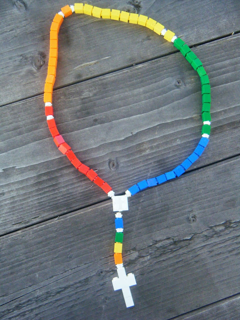 Last week I mentioned a project which I promised to share with you all and here it is. Actually I have been planning on sharing it with you since two Easters ago!!! Man am I a procrastinator. I was reading through my list of things to do and it has been at the bottom of the pile for a long time. Did any of you guess it was a lego rosary? Well, if you did, could you also tell me what the local winning lotto numbers will be? Actually my friend Cristina probably could have guessed because I discussed making them with her last year.