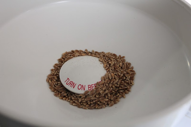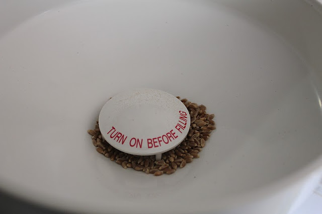 With my machine, you turn on the machine prior to putting the grain in. (read your own machines instructions) Set the machine to how fine or course you want to grind your wheat berries.