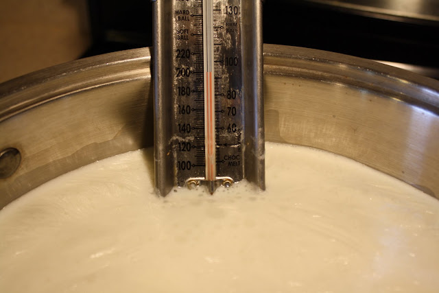 heat your milk to between 180 to 185 F. If you do not have a thermometer, just watch it to the moment right before the milk boils. Add 1/4 cup of vinegar to your pot