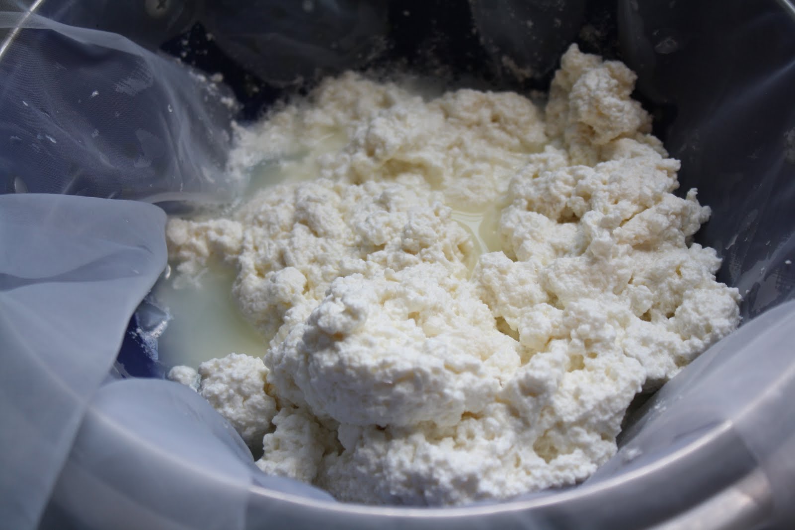 Cheesecloth (I use some sheer curtain fabric because I hate to throw away and continue buying cheese cloth plus the weave is much smaller and the cheese looks nicer to me. Shhhhh, thats my little secret that I share with you. Go get one of those old curtains out of your linen closet and give it a new home. The liquid goes right through but the solid stays perfectly, much better than cheese cloth.