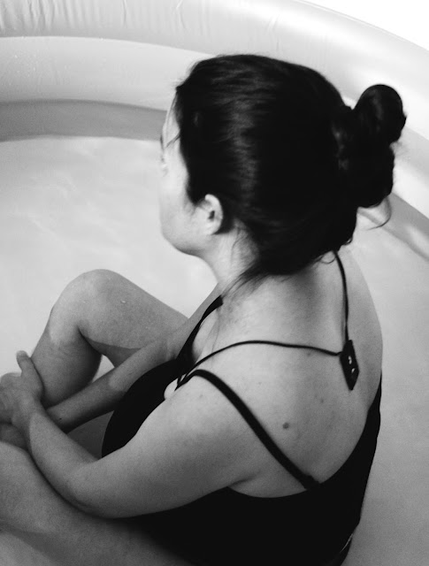 As soon as Alex came in through the door I started to feel more like I was in labor. We got me in the pool while she got her camera ready. The waves that were hitting my body were definitely labor now and though I could talk and smile in between them, they were getting very strong. The warm water felt good on my skin as I rocked back and forth in the pool. A few more waves and my midwife told me to push whenever I felt the urge. I sat in the warm water thinking how I did not feel like I was that close to having my baby and all of a sudden it was there, the urge to push. It was now that the pain hit me like a ton of bricks and I could feel myself losing my wits a bit and wanting to feel sorry for myself. I know that this is were the heroine is triumphant and strong and takes charge but I wanted to feel sorry for myself and give into this pain. I am human and I felt small and weak and scared. Then all of a sudden I felt Poppa’s strong hands on my shoulders and his legs supporting me from behind. He wiped the sweat from my forehead and told me that I was strong. I heard the voices of those women who were there to support me telling me that I was doing it, that I was doing great.