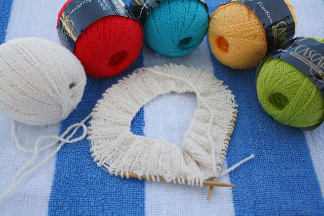 We have spent our days swimming at the pool, playing on the beach, taking naps and eating lots of good food. I have been knitting in the shade as much as possible. Last week when I posted that I had received the wrong color of Cascade yarn to work on the knitted swimsuit for Livie, I got a bunch of responses telling me that they had a long wait to receive the correct color. I was hopeful but told myself not to get my hopes up high. Then the day before we were leaving for vacation, I found the yarn in my mailbox. I was so happy. I’d had visions all week of myself on the beach working on that sweet swimsuit while my kids played happily nearby and now I could make it a reality.