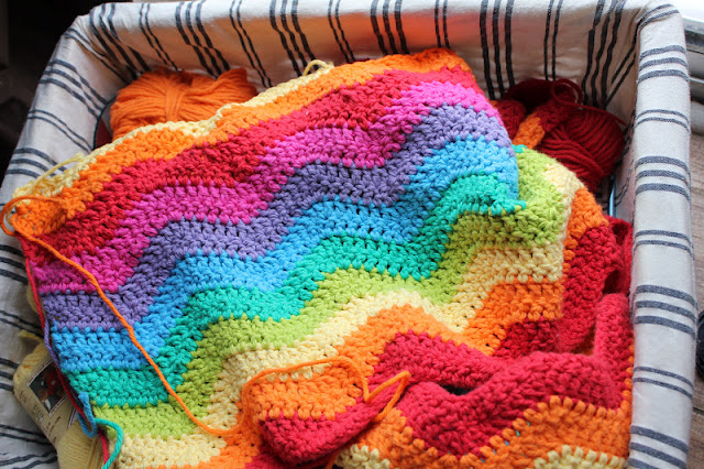 I have been working on this rainbow afghan for baby bean and am finally seeing some progress.  I originally bought enough yarn to complete it but can’t find one of the bags of yarn so hopefully it is in the sewing room somewhere but I have enough to do a bunch more rows.  I can’t wait to see it in the crib!