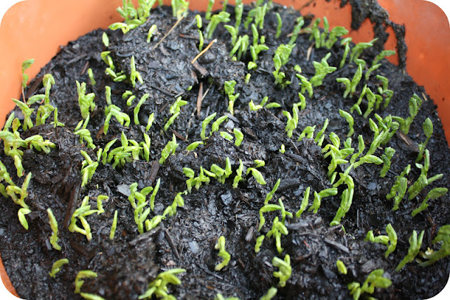 do you remember last weeks shot of these just planted pea shoots, they finally popped up out of the ground so I planted two more pots full. These should be a salad in another week and a half.