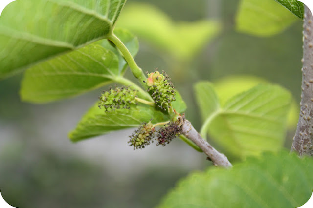 I found lots of little mulberries growing on our tree down by the pond (the one that never gets watered and somehow still lives)