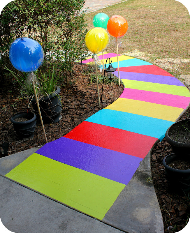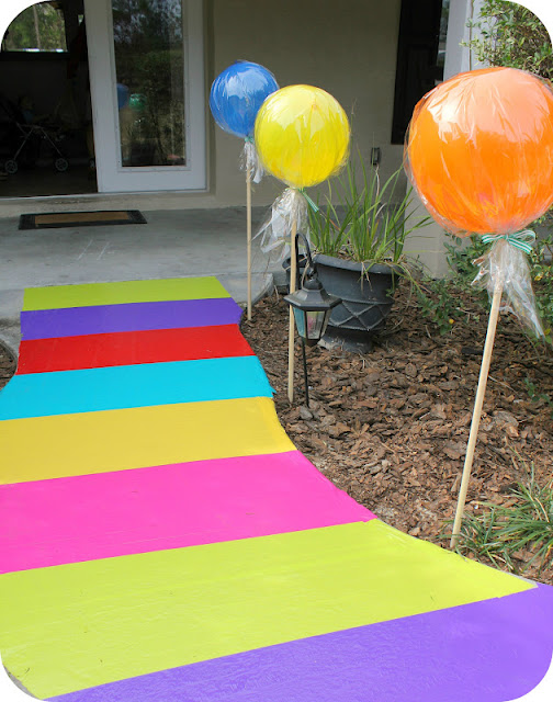 Hi I really need to know how you made the candyland game boards on the pathway to the house. I think it looks great and want to do it for my daughters upcoming party. please help! Also, where did you find those sticks to hold up the balloons?