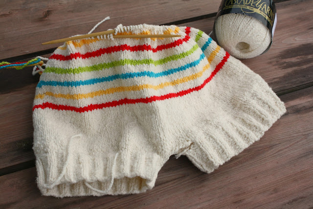A few weeks ago, I remembered the sunsuit (Rav notes here) I started knitting for Livie nearly a year ago while pregnant with Matthew. I even remembered that it was still in the bag I packed it in after our vacation to Miami Beach. Does anyone else do this, I mean stash projects away like squirrels stash nuts in trees? I have no idea how many half finished projects I even have somewhere around here, glad I remembered this one.