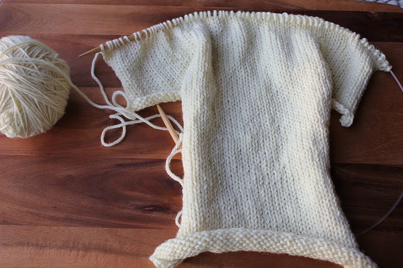 I am working on the easiest sweater I could find on Ravelry. It is a kimono sweater, you can see what it here. It is made for a baby but I am playing around with the pattern to fit my sworthy 2 year old. This will be the first garment I have ever made. I have not knitted in years and even back then it was just a sorry little scarf…nothing to write home about.