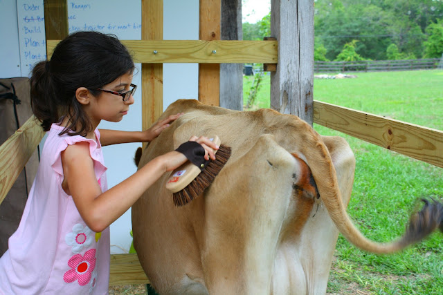 once we are done with the milking, Erica will brush her all down to say thank you for giving us our milk for the day. She also sprays her down with a fly spray that I make from essential oils.
