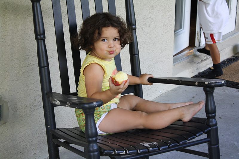 Olivia (in her natural playing state of dirtyness) was enjoying her apple when she spotted Rooster and Hen (also known as Mr and Mrs Duck) getting in on the front porch action and had to go investigate pester the poor ducks and chickens.  Those two really think they are chickens.