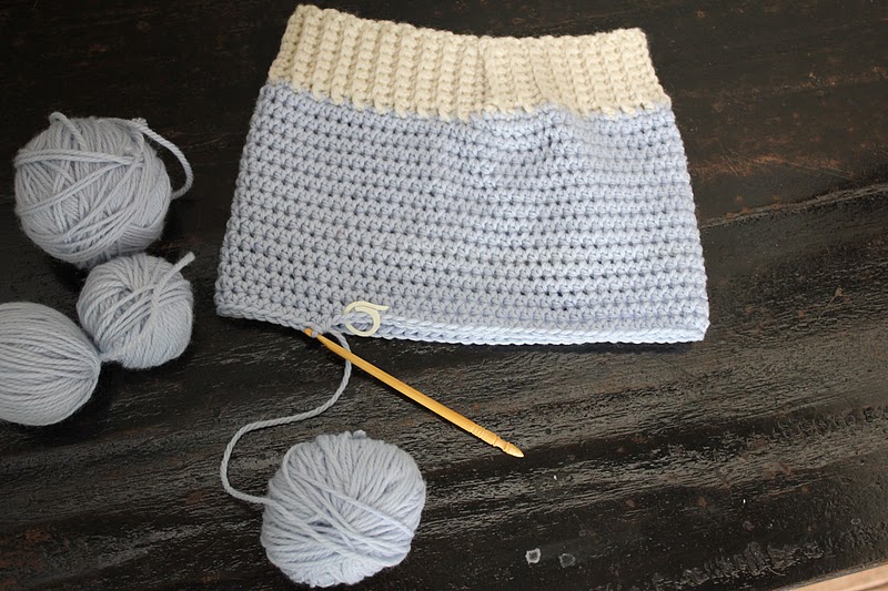 Two days from now will be the first day of fall and I am working on winter. Livie’s longies from last year definetely will not fit her this year so I digged into my stash and found a few hanks of a discontinued super soft wool in a light baby blue I had found at Joanns three years ago. I had a little of my favorite ivory colored wool which was just enough to make the waist band (I love it when I can find a use for those little bits of yarn).