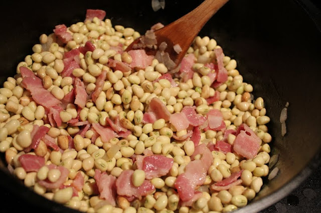 Add the rinsed peas to the pot and let the peas cook in the bacon fat for a few minutes, mixing occasionally.