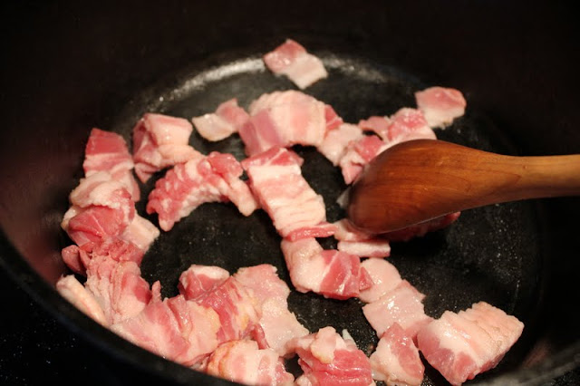 Once the onion is soft and the bacon has rendered some of its fat, add the garlic but be careful that the garlic does not burn.