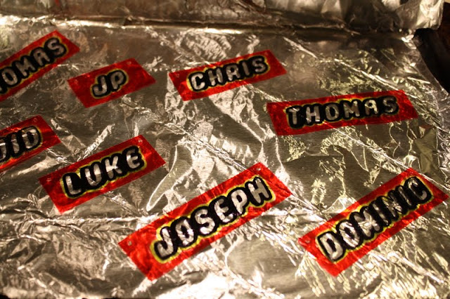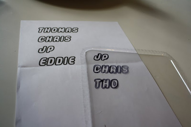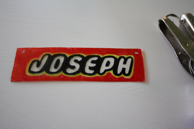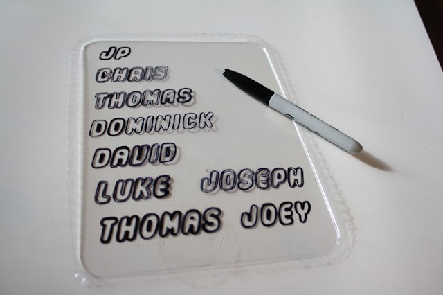 Next, I downloaded a lego font from here and printed all the names I needed.  Increase the size of your font until it is about 1.5 inches tall.  Your plastic strips will be about 2 to 2.5 inches tall and as wide as the name on them. With a black sharpie I traced them. The finished project will be 1/3rd smaller than when it began and about 3 times thicker so keep this in mind while planning your project.