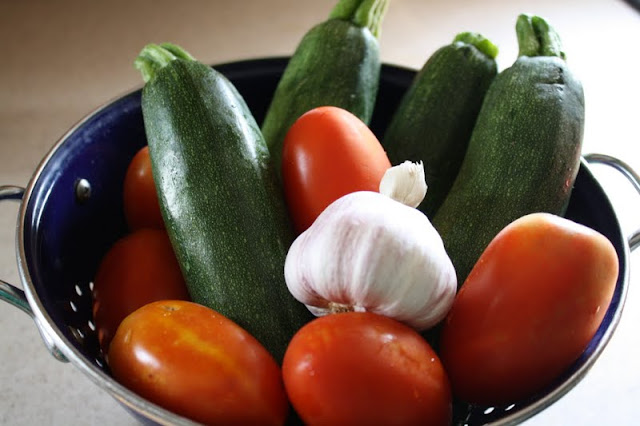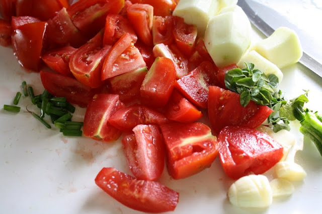 rough chop your tomatoes, the left over core of the zucchini, herbs and either mince or chop the garlic as small as you can