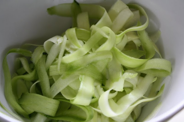 place your zucchini pasta ribbons on a plate and pour the sauce on top.